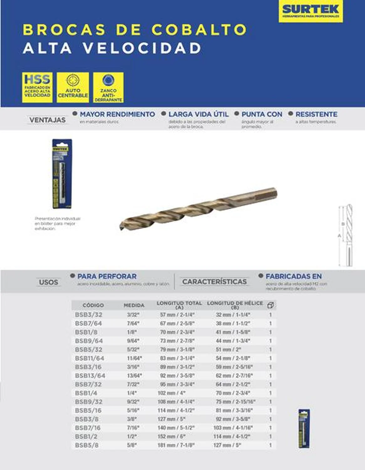 MARCA: Surtek DESCRIPCION DEL PRODUCTO: -Broca de cobalto HSS de 1/4″, longitud total: 102 mm, longitud de zanco: 32 mm, longitud de corte: 70 mm.-Ángulo de 135°, ideal para acero inoxidable, acero, aluminio, latón y cobre.-No necesitan refrigeración, resistente a altas temperaturas, larga vida útil, mayor rendimiento en materiales duros.-Punta autocentrable. Zanco antideslizante.-Broca de cobalto HSS para acero inoxidable, acero, aluminio, latón y cobre. ESPECIFICACIONES TECNICAS: CONTENIDO DEL PAQUETE: 1 broca. GARANTIA: Sin garantía ALTO EN CM: 18 LARGO EN CM: 5 FONDO EN CM: 0.67 PESO EN KG: 0.0228