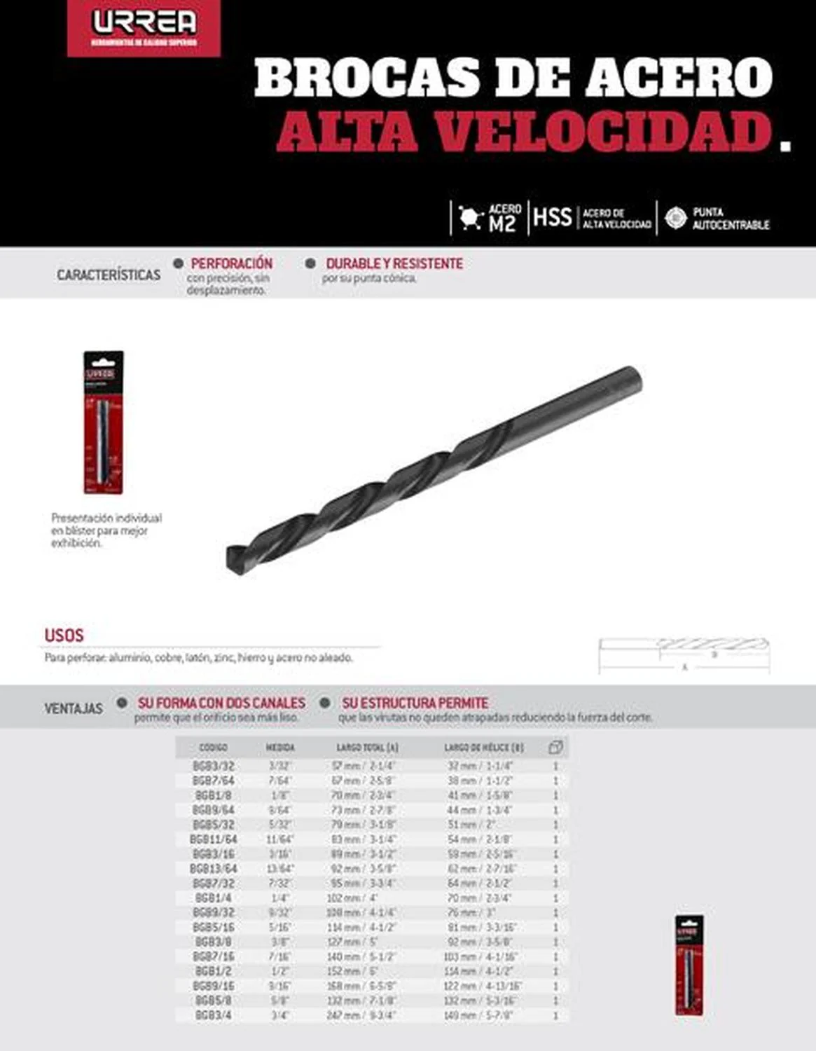 MARCA: Urrea DESCRIPCION DEL PRODUCTO: -Medida: 11/64″.-Ángulo: 135°.-Largo total: 30 mm.-Tipo de acero: M2. Tipo de mango: paralelo.-Apto para cortar: aluminio, cobre, latón, zinc, hierro y acero no aleado.-Broca negra de alta velocidad para uso en perforación de metal, barrenado/ perforado en estructuras de metal, barrenado/ perforado en marcos de aluminio. ESPECIFICACIONES TECNICAS: CONTENIDO DEL PAQUETE: 1 broca negra de acero de alta velocidad. GARANTIA: Sin garantía ALTO EN CM: 18 LARGO EN CM: 5 FONDO EN CM: 5 PESO EN KG: 0.0078