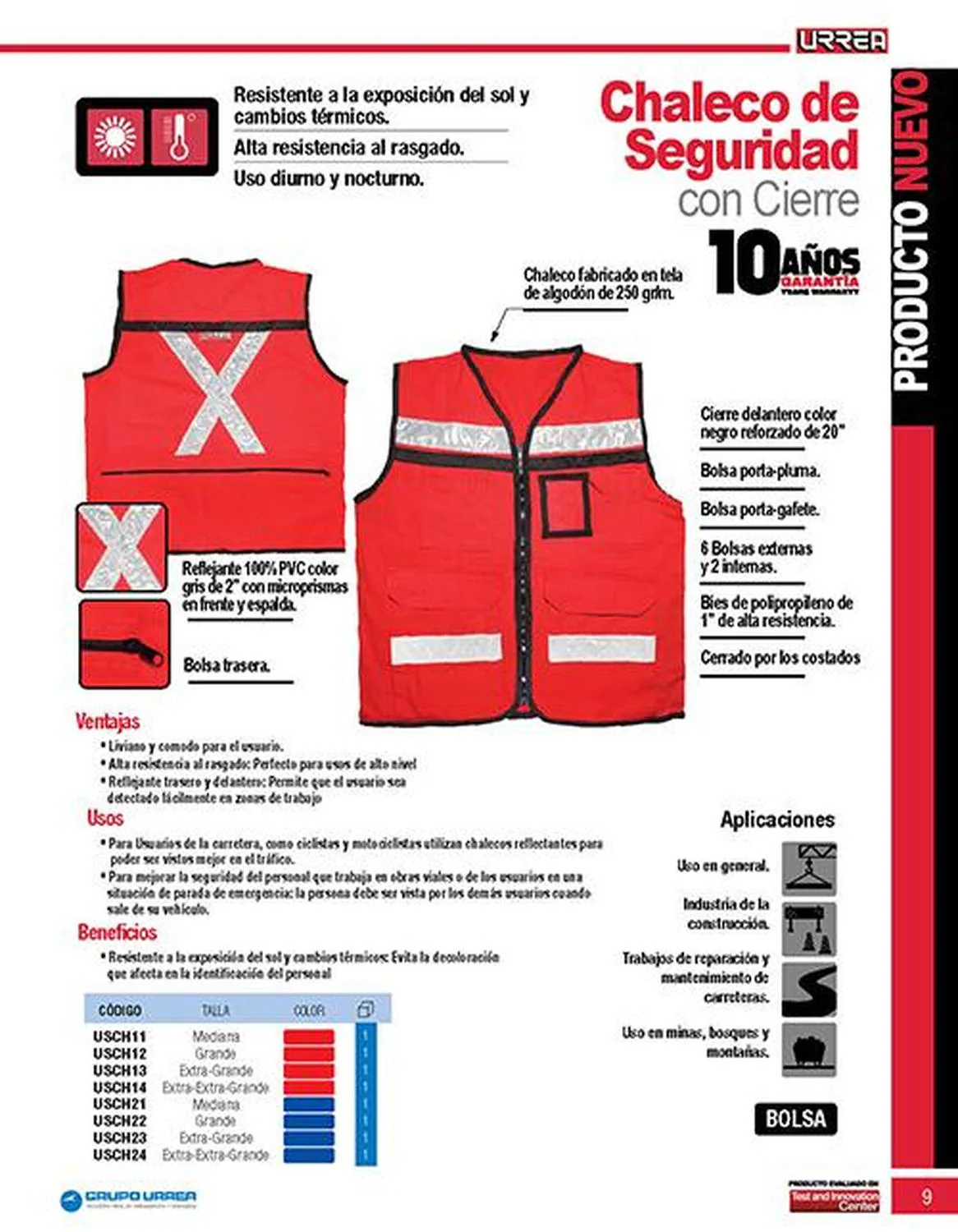 MARCA: Urrea DESCRIPCION DEL PRODUCTO: -Chaleco fabricado en tela de algodón de 250 gr/m. Reflejante 100% PVC color gris de 2″ con microprismas en frente y espalda. Cerrado por los costados. Bies de polipropileno de 1″ de alta resistencia-Resistente a la exposición del sol y cambios térmicos. Alta resistencia al rasgado. Uso diurno y nocturno-Cierre delantero color negro reforzado de 20″. Bolsa porta pluma, bolsa porta gafete, 6 bolsas externas y 2 internas, bolsa trasera-Para mejorar la seguridad del personal que trabaja en obras viales, para usuarios en carreteras como ciclistas o motociclistas que usan chalecos reflejantes para poder ser vistos mejor en el tráfico-Aplicaciones: uso general, industria de la construcción, trabajos de reparación y mantenimiento de carreteras, uso en minas, bosques y montañas ESPECIFICACIONES TECNICAS: -Número De Bolsillos: 8-Clase Ansi: 2-Color: Rojo-Color Del Reflejante: Blanco-Género: Unisex-Material: Algodón-Tamaño: Extra Grande-Tipo De Cierre: Cremallera CONTENIDO DEL PAQUETE: Chaleco de seguridad. GARANTIA: 1 año ALTO EN CM: 6 LARGO EN CM: 27.2 FONDO EN CM: 21.6 PESO EN KG: 0.564