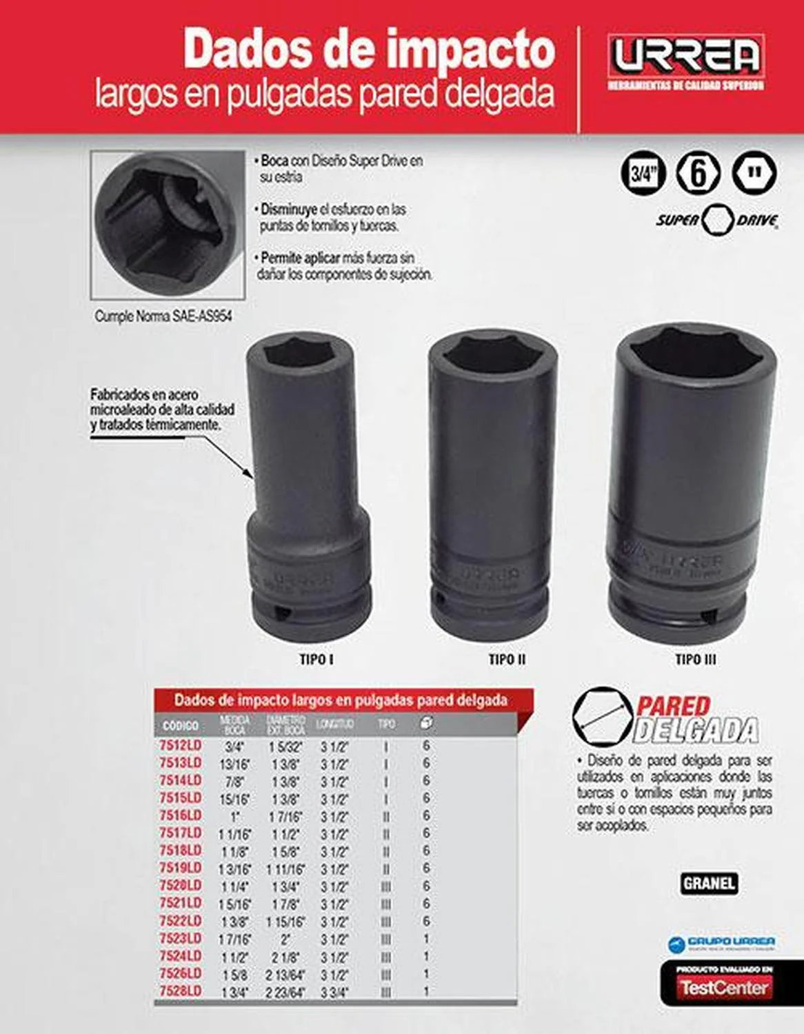 MARCA: Urrea DESCRIPCION DEL PRODUCTO: -Juego de dados largos Urrea de impacto cuadro 3/4″ estándar 6 puntas geometría lobular, acabado fosfatado-Cuenta con diseño de pared delgada para ser utilizados en aplicaciones donde las tuercas o tornillos están muy juntos entre si o con espacios pequeños para ser acoplados-Medida boca 1 3/16″-Tipo ll ESPECIFICACIONES TECNICAS: -Longitud: 3 1/2″-Medida: 1-3/16″-Sae O Métrico: Sae-Tamaño De Impulsor: 3/4″-Tipo De Dado: Ii-Tipo De Impulsión: Cuadrado CONTENIDO DEL PAQUETE: Dado GARANTIA: 1 año ALTO EN CM: 4.3 LARGO EN CM: 4.3 FONDO EN CM: 14.5 PESO EN KG: 0.58