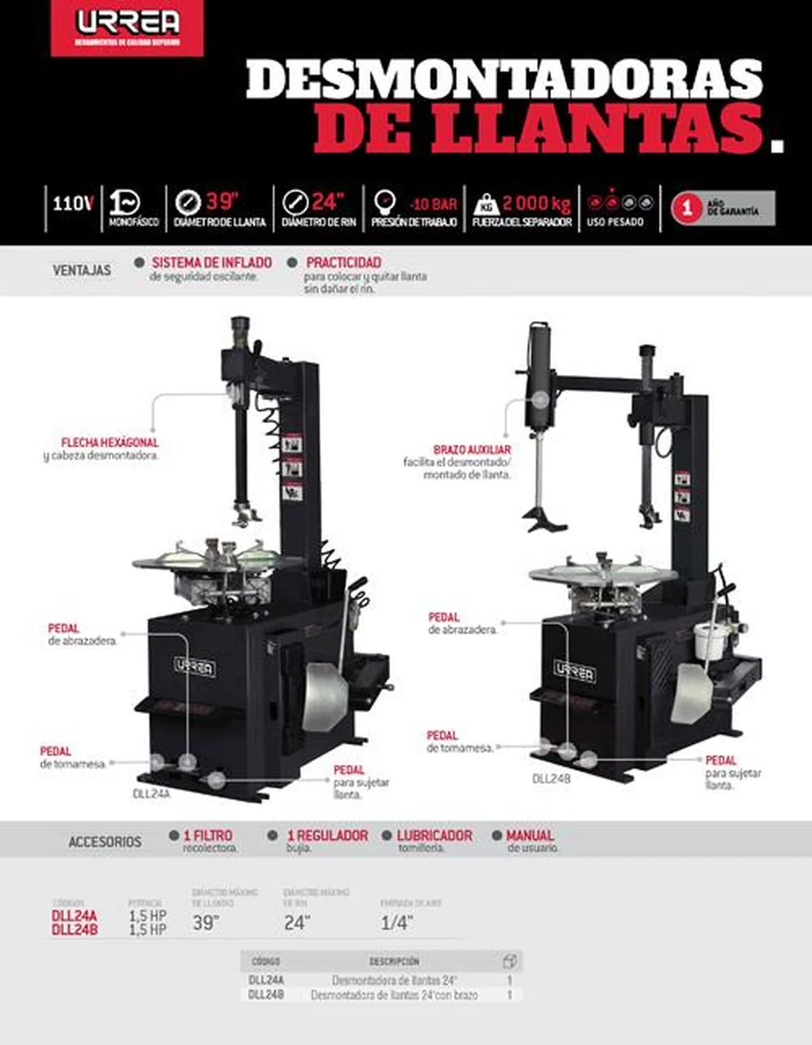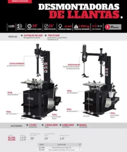 MARCA: Urrea DESCRIPCION DEL PRODUCTO: -Diámetro máximo de llanta: 39″.-Fuerza de separación de llantas: 2 000 kg. -Voltaje-frecuencia: 110 V – 60 Hz.-Presión de trabajo: 6-10 bar.-Potencia de motor: 1-1/2 HP.-Flecha hexágonal y cabeza desmontadora.-La máquina está diseñada para montar, desmontar e inflar una llanta dentro de los límites especificados. ESPECIFICACIONES TECNICAS: CONTENIDO DEL PAQUETE: 1 filtro, 1 regulador, 1 lubricador. GARANTIA: 1 año ALTO EN CM: 96.5 LARGO EN CM: 98 FONDO EN CM: 76 PESO EN KG: 188