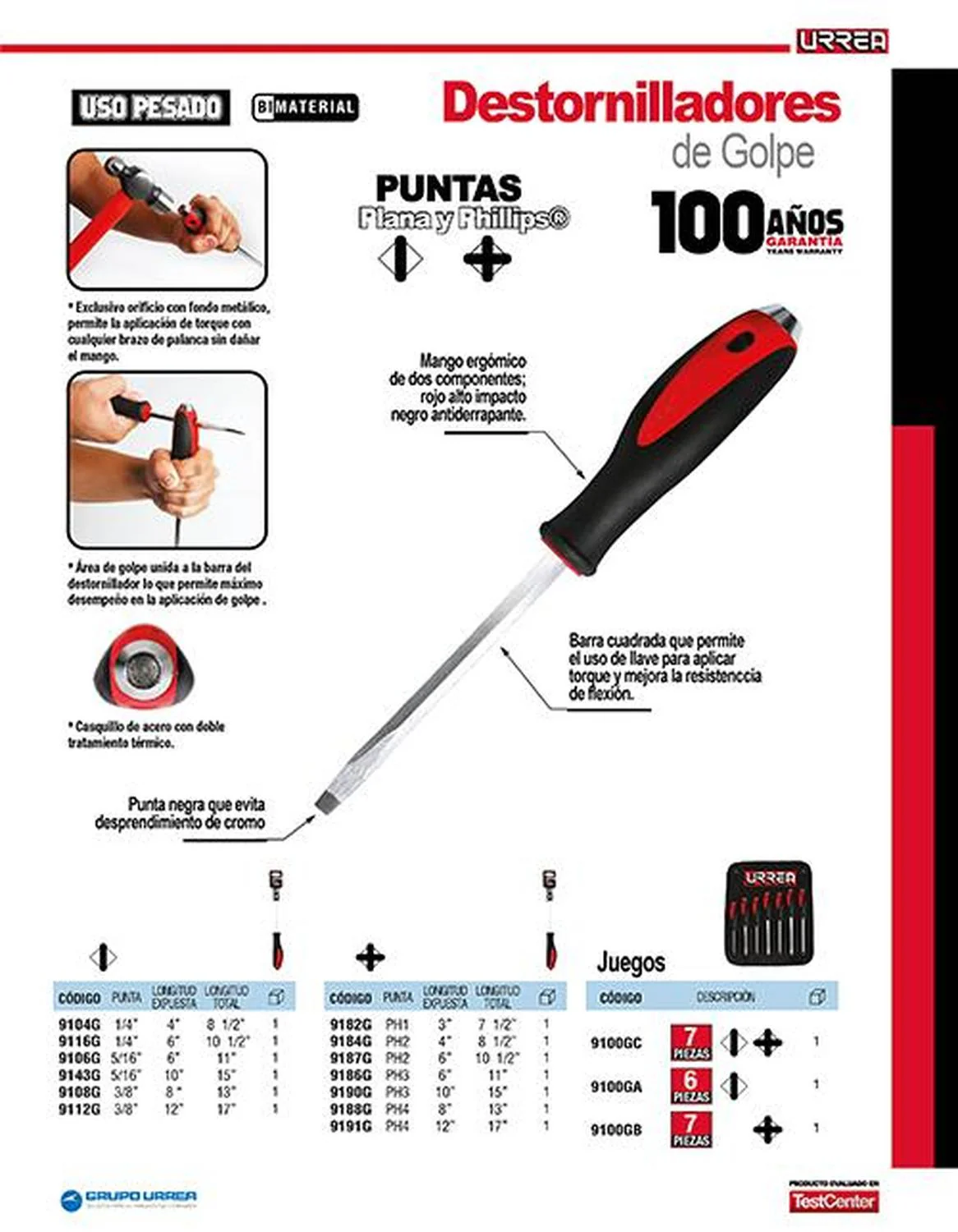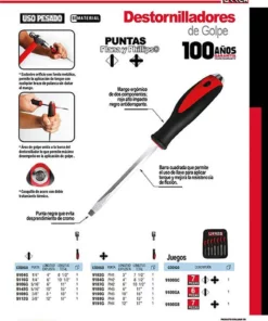 MARCA: Urrea DESCRIPCION DEL PRODUCTO: -Destornillador de golpe barra cuadrada punta plana 5/16″ x 6″-Punta negra evita desprendimiento de cromo-Barra cuadrada permite el uso de llave para aplicar torque y mejora la resistencia a la flexión- mango ergonómico de dos componentes: rojo de alto impacto y negro antiderrapante-Exclusivo orificio con fondo metálico para de palanca e incrementar el torque-Casquillo de acero con doble tratamiento térmico ESPECIFICACIONES TECNICAS: -Barra: Cuadrada-Categoría: Barra Cuadrada Punta Plana-Grosor Barra: 5/16″-Longitud De Barra: 6″-Longitud Total: 11″-Tipo De Punta: Plana CONTENIDO DEL PAQUETE: destornillador de golpe GARANTIA: 1 año ALTO EN CM: 3.8 LARGO EN CM: 30 FONDO EN CM: 3.8 PESO EN KG: 0.251