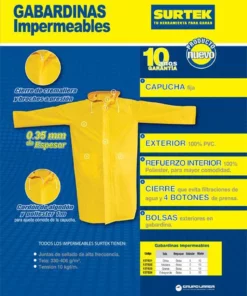 MARCA: Surtek DESCRIPCION DEL PRODUCTO: -Gabardina impermeable talla chica Surtek-100% PVC, interior de poliéster-Capucha fija-Con bolsas-Juntas de sellado de alta frecuencia ESPECIFICACIONES TECNICAS: -Color: Amarillo-Espesor: 0.35Mm-Interior: Poliéster-Material: Pvc-Talla: Chica CONTENIDO DEL PAQUETE: Gabardina GARANTIA: Sin garantía ALTO EN CM: 1.5 LARGO EN CM: 35 FONDO EN CM: 27 PESO EN KG: 1.002