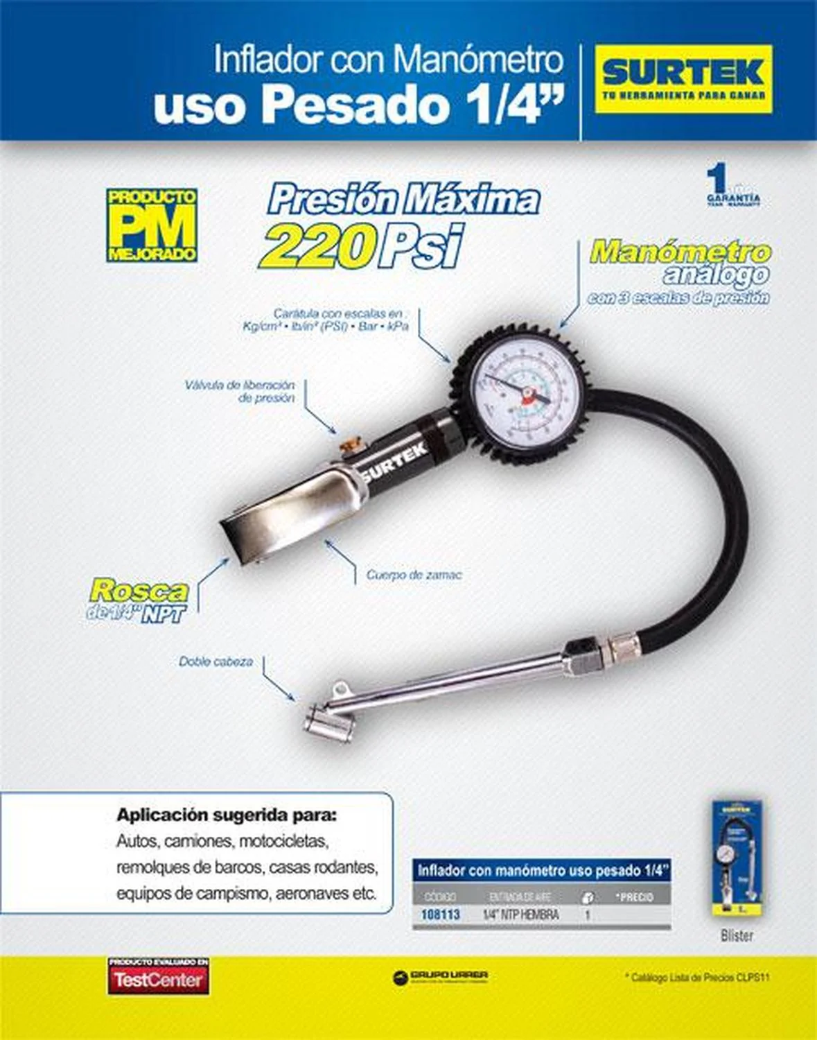 MARCA: Surtek DESCRIPCION DEL PRODUCTO: -Inflador con calibrador 1/4″ NPT Surtek-Presión máx 220 PSI-Cuerpo de zamac-Válvula de liberación de presión-Rosca de 1/4″ NPT-Doble cabeza ESPECIFICACIONES TECNICAS: -Material: Zamac-Rango De Presión: 0 A 220 Psi-Tamaño De Rosca Npt: 1/4″-Tipo De Conector: Macho/Hembra CONTENIDO DEL PAQUETE: inflador GARANTIA: Sin garantía ALTO EN CM: 36 LARGO EN CM: 9 FONDO EN CM: 16.5 PESO EN KG: 0.455