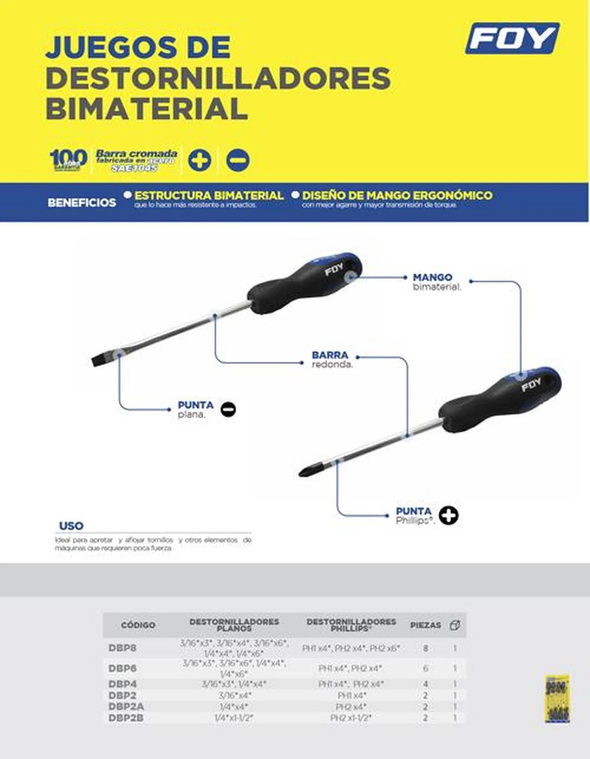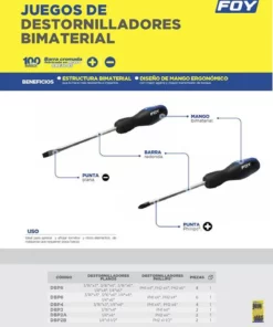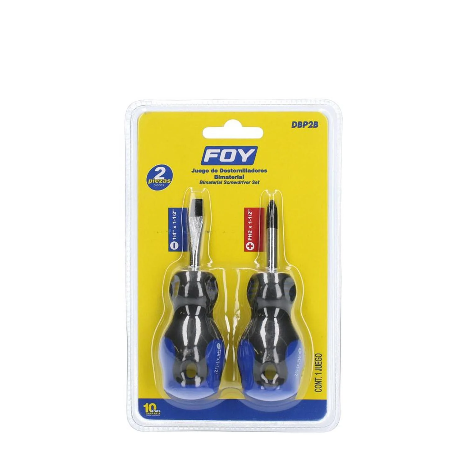 MARCA: Foy DESCRIPCION DEL PRODUCTO: -Juego de 2 destornilladores bimaterial 3/16.-Estructura Bimaterial.-Resistentes a impactos.-Cómodos al utilizarlos.-Se utiliza para apretar y aflojar tornillos y otros elementos de máquinas que requieren poca fuerza. ESPECIFICACIONES TECNICAS: CONTENIDO DEL PAQUETE: Destornillador bimaterial punta plana, 3/16″ x 4″, Destornillador bimaterial punta Phillips®,PH1 x 4″ GARANTIA: 10 años ALTO EN CM: 35 LARGO EN CM: 15 FONDO EN CM: 4 PESO EN KG: 0.138