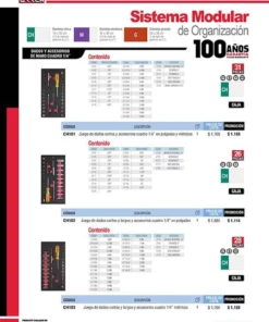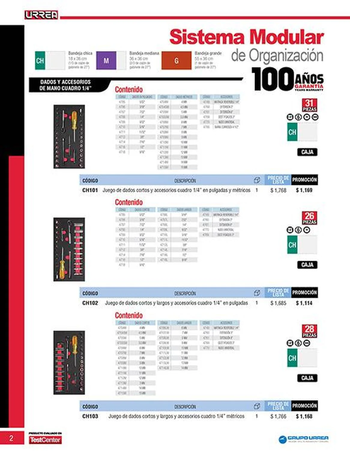 MARCA: Urrea DESCRIPCION DEL PRODUCTO: -Juego industrial de dados y accesorios de 31 piezas cuadro 1/4″ ESPECIFICACIONES TECNICAS: CONTENIDO DEL PAQUETE: Barra corrediza 1/4″x4-1/2″. Charola para juego CH101. Dado 1/4″ 6pts 10mm. Dado 1/4″ 6pts 11mm. Dado 1/4″ 6pts 12mm. Dado 1/4″ 6pts 13mm. Dado 1/4″ 6pts 14mm. Dado 1/4″ 6pts 15mm. Dado 1/4″ 6pts 4.5mm. Dado 1/4″ 6pts 4mm. Dado 1/4″ 6pts 5.5mm. Dado 1/4″ 6pts 5mm. Dado 1/4″ 6pts 6mm. Dado 1/4″ 6pts 7mm. Dado 1/4″ 6pts 8mm. Dado 1/4″ 6pts 9mm. Dado 1/4″6pts 1/2″. Dado 1/4″6pts 1/4″. Dado 1/4″6pts 11/32″. Dado 1/4″6pts 3/16″. Dado 1/4″6pts 3/8″. Dado 1/4″6pts 5/16″. Dado 1/4″6pts 5/32″. Dado 1/4″6pts 7/16″. Dado 1/4″6pts 7/32″. Dado 1/4″6pts 9/16″. Dado 1/4″6pts 9/32″. Dest p/dados 1/4×3″. Etiqueta para juego CH101. Extensión de 1/4×3″. Extensión de 1/4×6″. Matraca 1/4″ reversible. Nudo universal 1/4″. GARANTIA: 1 año ALTO EN CM: 18.8 LARGO EN CM: 7.2 FONDO EN CM: 38.2 PESO EN KG: 1.08