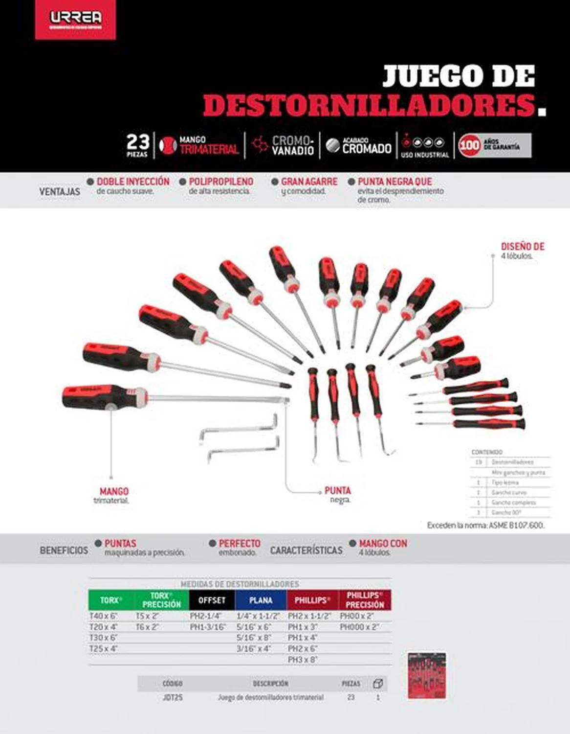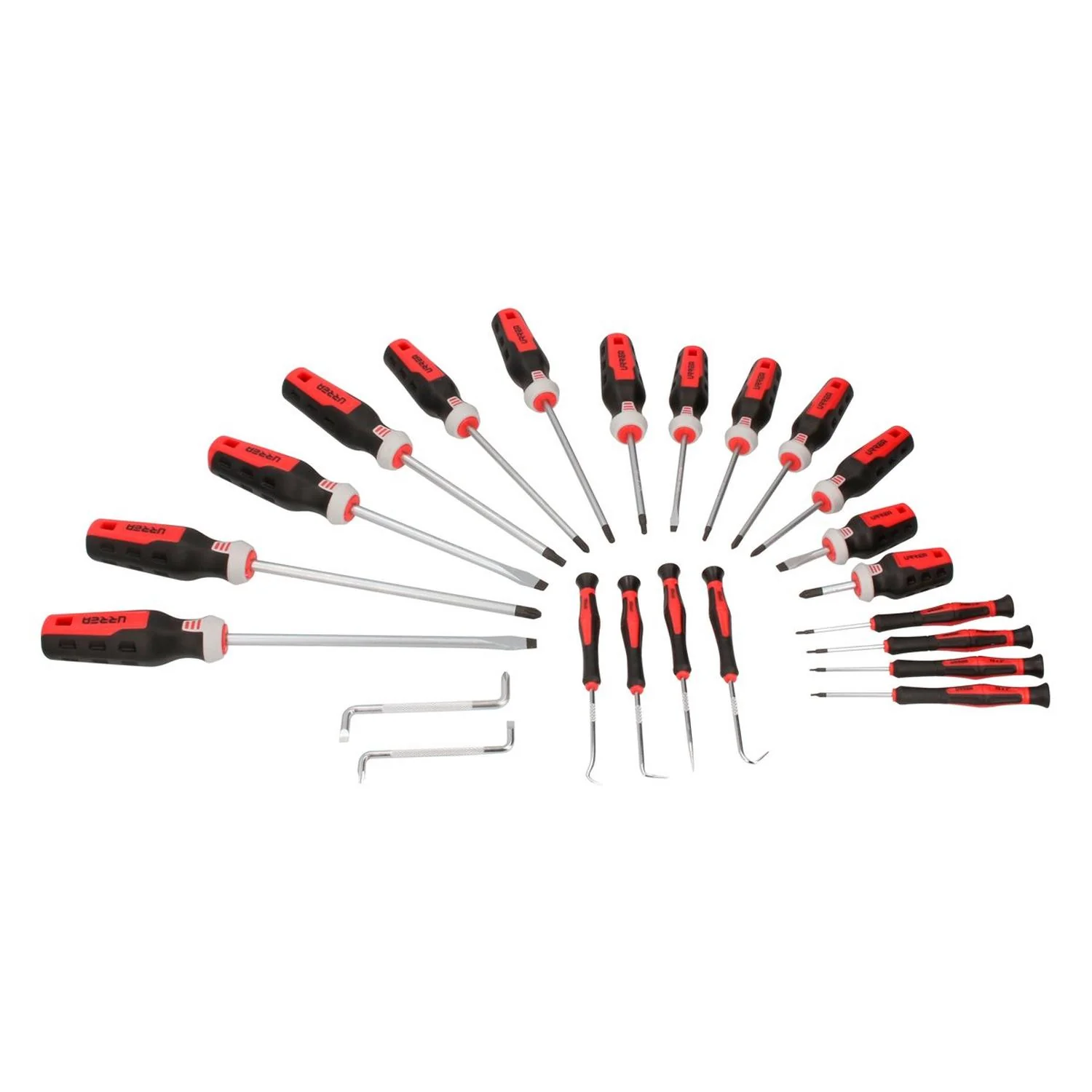 -Contenido: 4 piezas planos: 1/4″x 1-1/2″, 5/16″ x 6″, 5/16″ x 8″, 3/16″ x 4″. Phillips: PH2 x 1-1/2″, PH1 x 3″, PH1 x 4″, PH2 x 6″, PH3 x 8″. Torx: T30 x 6″, T40 x 6″, T25 x 4″, T20 x 4″. Precisión: PH00 x 2″, PH000 x 2″, T5 x 2″, T6 x 2″. Mini ganchos y punta: Tipo lezma. Gancho curvo, gancho completo, gancho 90°. Tipo de barra: Redonda.-Material de barra: cr-v. Material de punta: cr-v. -Acabado: Cromado.-Material del maneral: PP+TPR.-Tipo de barra: Redonda.-Desatornillar, atornillar.