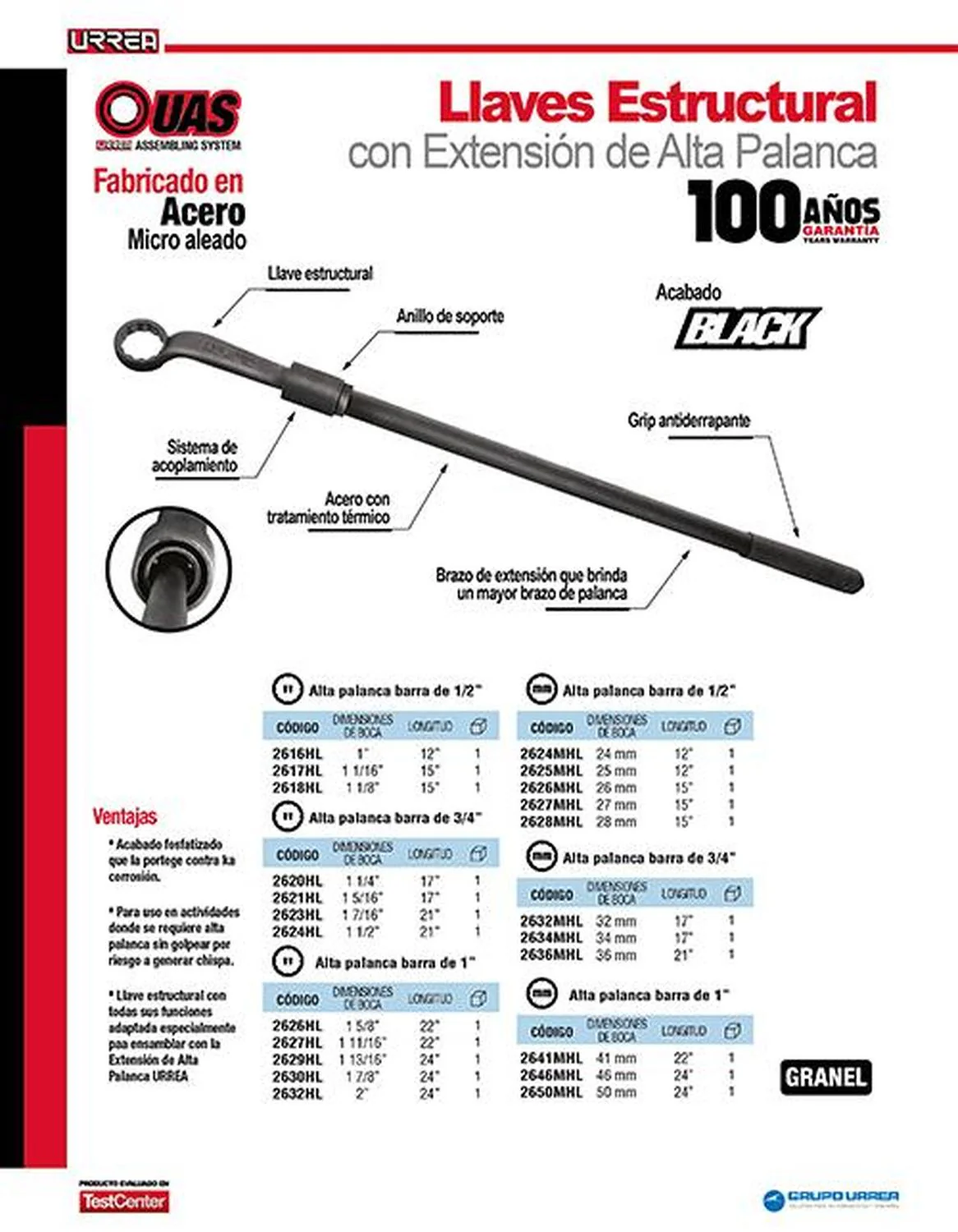 MARCA: Urrea DESCRIPCION DEL PRODUCTO: -Estas llaves permiten trabajar en posición vertical y horizontal en lugares de difícil acceso, su diseño le permite generar un óptimo torque sin posibilidad de generar alguna lesión al usuario por la liberación de la llave, siendo esta una llave de alta palanca muy segura ESPECIFICACIONES TECNICAS: -Longitud: 21″-Resistencia De Torsión: 17500 Lb-Pulg-Sae O Métrico: Sae CONTENIDO DEL PAQUETE: Llave estructural alta palanca 1 1/2″ GARANTIA: ALTO EN CM: 1.4 LARGO EN CM: 53 FONDO EN CM: 1 PESO EN KG: 1.45