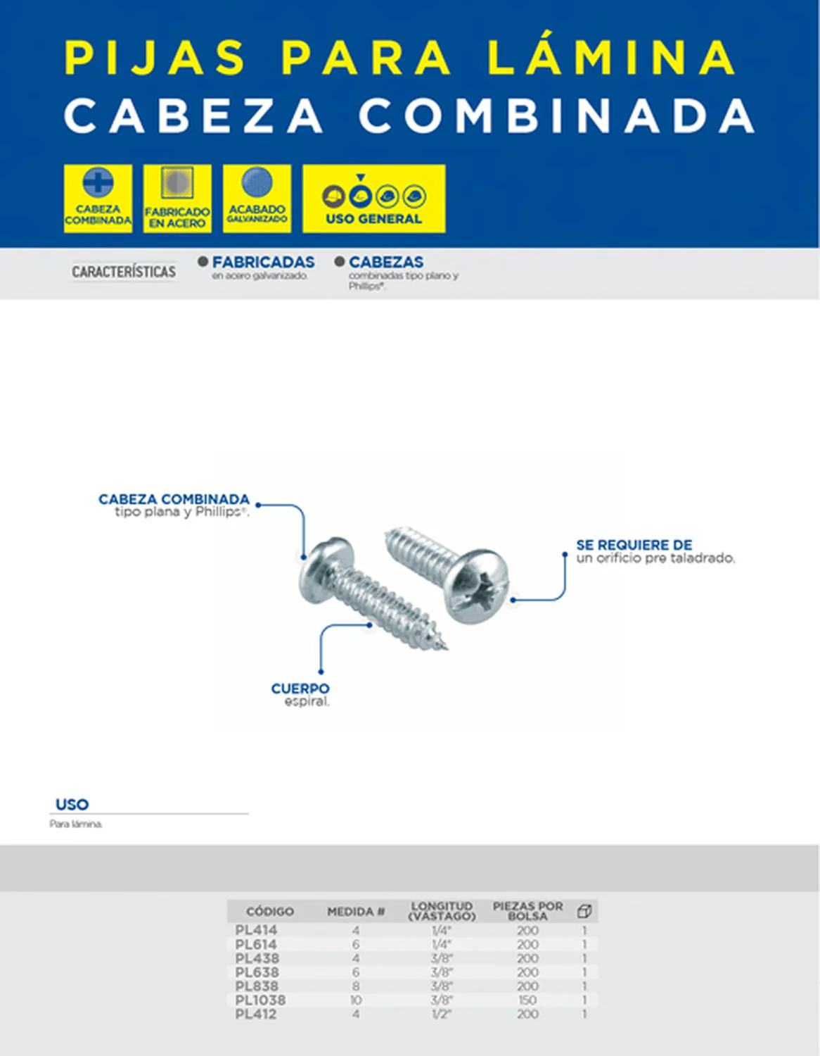 -Pijas para lámina, cabeza combinada.