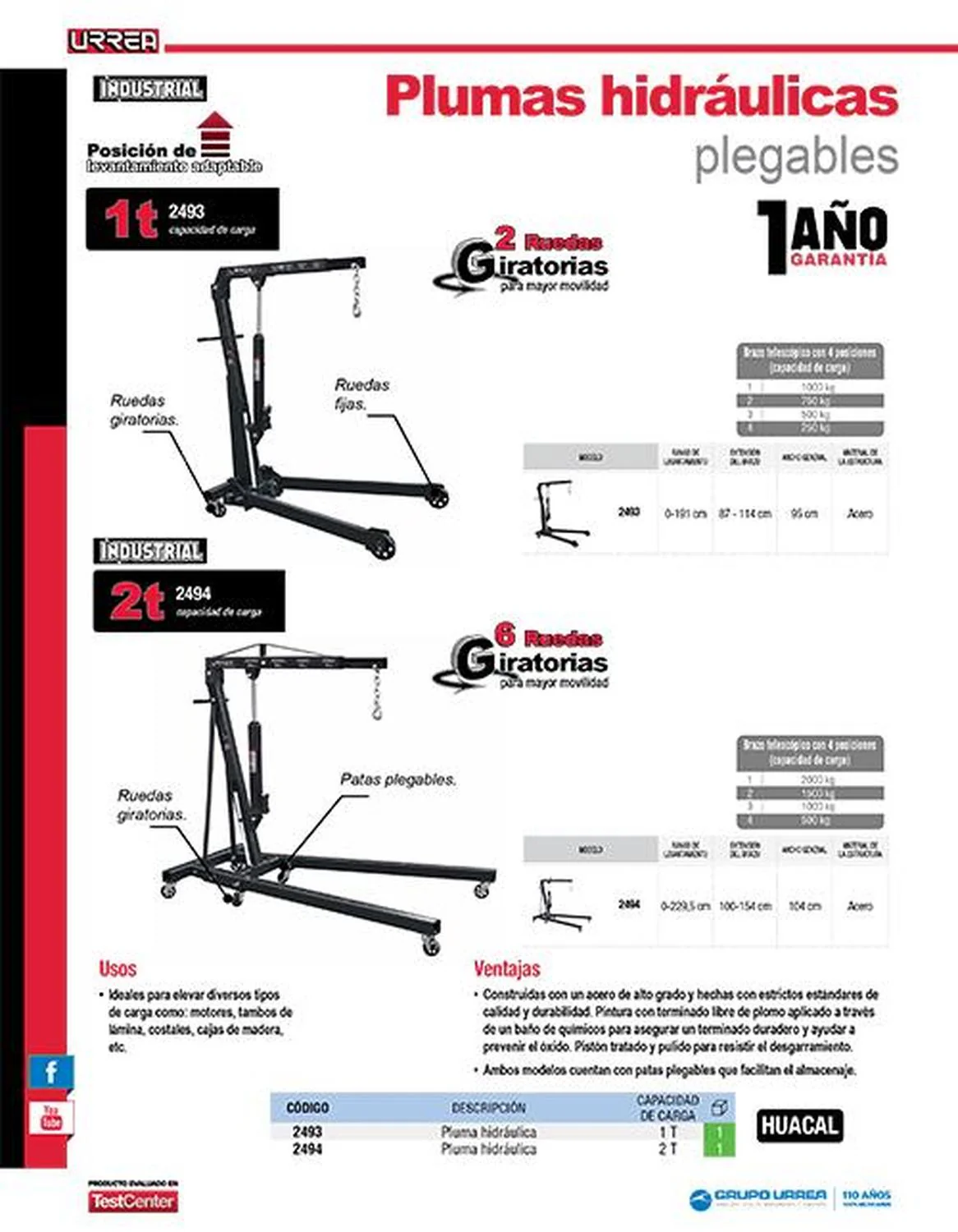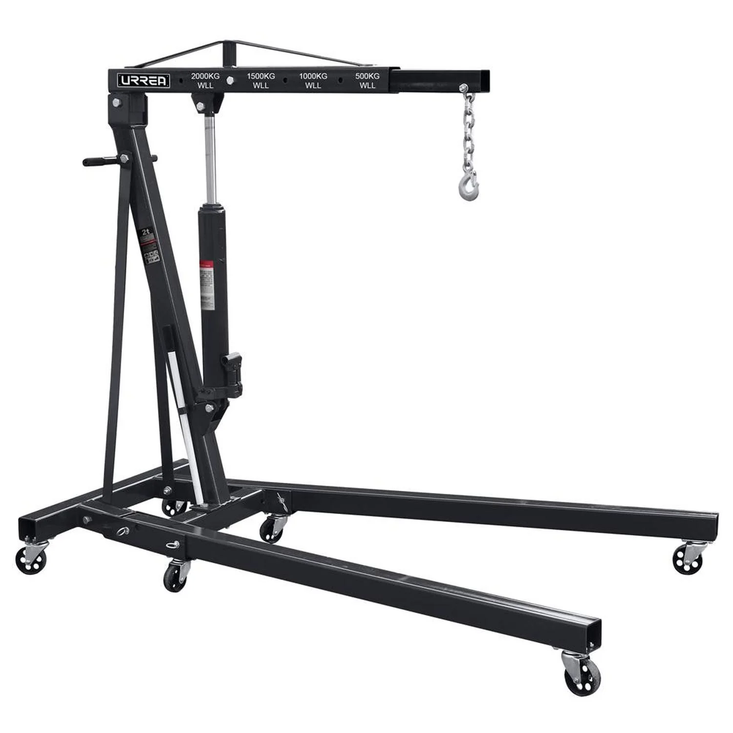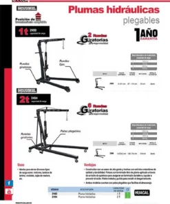 MARCA: Urrea DESCRIPCION DEL PRODUCTO: -Capacidad de 2Ton. Rango de Levantamiento: 0-229,5cm. Extensión del Brazo: 100-154cm. Ancho General: 104cm. Material de la Estructura: Acero. Peso: 88 kgs.-Estructura de acero. 6 ruedas giratorias para mayor movilidad.-Patas plegables. Posición de levantamiento adaptable. ESPECIFICACIONES TECNICAS: -Capacidad De Carga: 2 Ton-Incluye: 6 Ruedas Giratorias-Material: Acero-Rango De Levante Máximo: 0-229.5 Cm-Capacidad De Pluma Posición 1: 2000 Kg-Capacidad De Pluma Posición 2: 1500 Kg-Capacidad De Pluma Posición 3: 1000 Kg-Capacidad De Pluma Posición 4: 500 Kg-Extensión Del Brazo: 100-154 Mm CONTENIDO DEL PAQUETE: Pluma hidráulica GARANTIA: 1 año ALTO EN CM: 30 LARGO EN CM: 63 FONDO EN CM: 169 PESO EN KG: 120