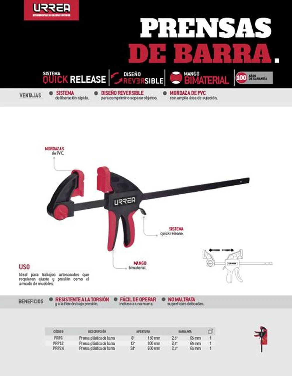 MARCA: Urrea DESCRIPCION DEL PRODUCTO: -Mordazas de PVC con amplia área de sujeción. Mango TPR. Apertura máxima de 12″ (300mm).-Sistema Quick Release de fácil liberación.-Muy fácil de operar, incluso a una mano.-Resistente a la torsión y a la flexión bajo presión.-Diseño reversible, para comprimir o separar objetos.-Prensa plástica de barra ideal para trabajos artesanales que requieren ajuste y presión como el armado de muebles. ESPECIFICACIONES TECNICAS: CONTENIDO DEL PAQUETE: Prensa plástica GARANTIA: 100 años ALTO EN CM: 50.5 LARGO EN CM: 18.5 FONDO EN CM: 4 PESO EN KG: 1.2