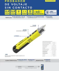 MARCA: Surtek DESCRIPCION DEL PRODUCTO: -Rango de frecuencia 50/60Hz, cuenta con zumbidos e indicador de luz led.-Voltaje de CA(Bajo): 24 ~ 1000V. Voltaje de CA(Alto): 90 ~ 1000V. Temperatura de operación: 0 a 40 °C / 32° F a 104 °F. Temperatura de almacenamiento: -200 °C a 50 °C / -4° F to 122 °F.-Protección CAT IV 1000V.-Detector de voltaje sin contacto adecuado para probar cables o líneas eléctricas, automóviles u otros dispositivos, además de utilizarse para realizar instalaciones o detectar problemas de accesorios eléctrico, así como para indicar si están correctamente conectados. ESPECIFICACIONES TECNICAS: CONTENIDO DEL PAQUETE: Probador volt s/cont 24-1000V, manual de usuario pequeño GARANTIA: 1 año ALTO EN CM: 15 LARGO EN CM: 23 FONDO EN CM: 15 PESO EN KG: 2.2