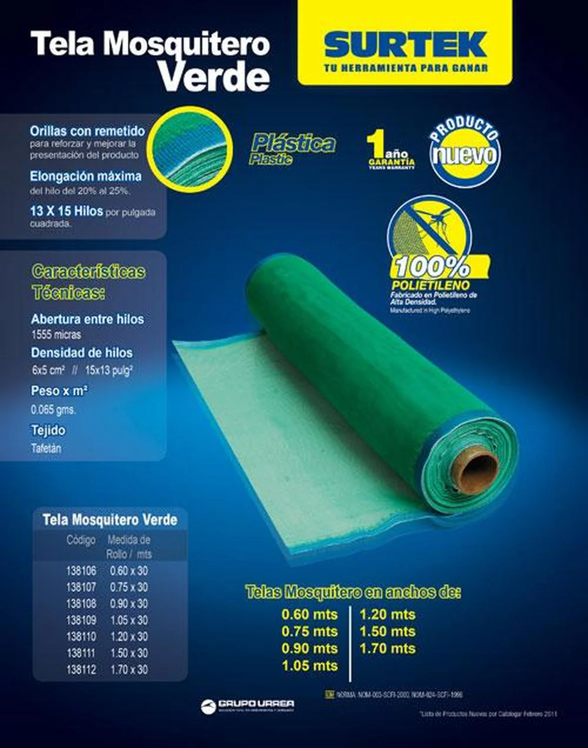 MARCA: Surtek DESCRIPCION DEL PRODUCTO: -100% polietileno de alta densidad-Orillas con remetido para reforzar y mejorar la presentación del producto-Elongación máxima del hilo del 20 al 25%-Peso por m2 0.065 kg-Tejido tipo tafetán ESPECIFICACIONES TECNICAS: -Ancho: 1.05 M-Color: Gris-Diámetro De Hilo: 0.20 Mm-Longitud: 30 M-Material: Polietileno 100%-Tramada (Hilos): 13X15 H/Pulg2 CONTENIDO DEL PAQUETE: tela para mosquitero GARANTIA: ALTO EN CM: 13 LARGO EN CM: 114 FONDO EN CM: 13 PESO EN KG: 2.8
