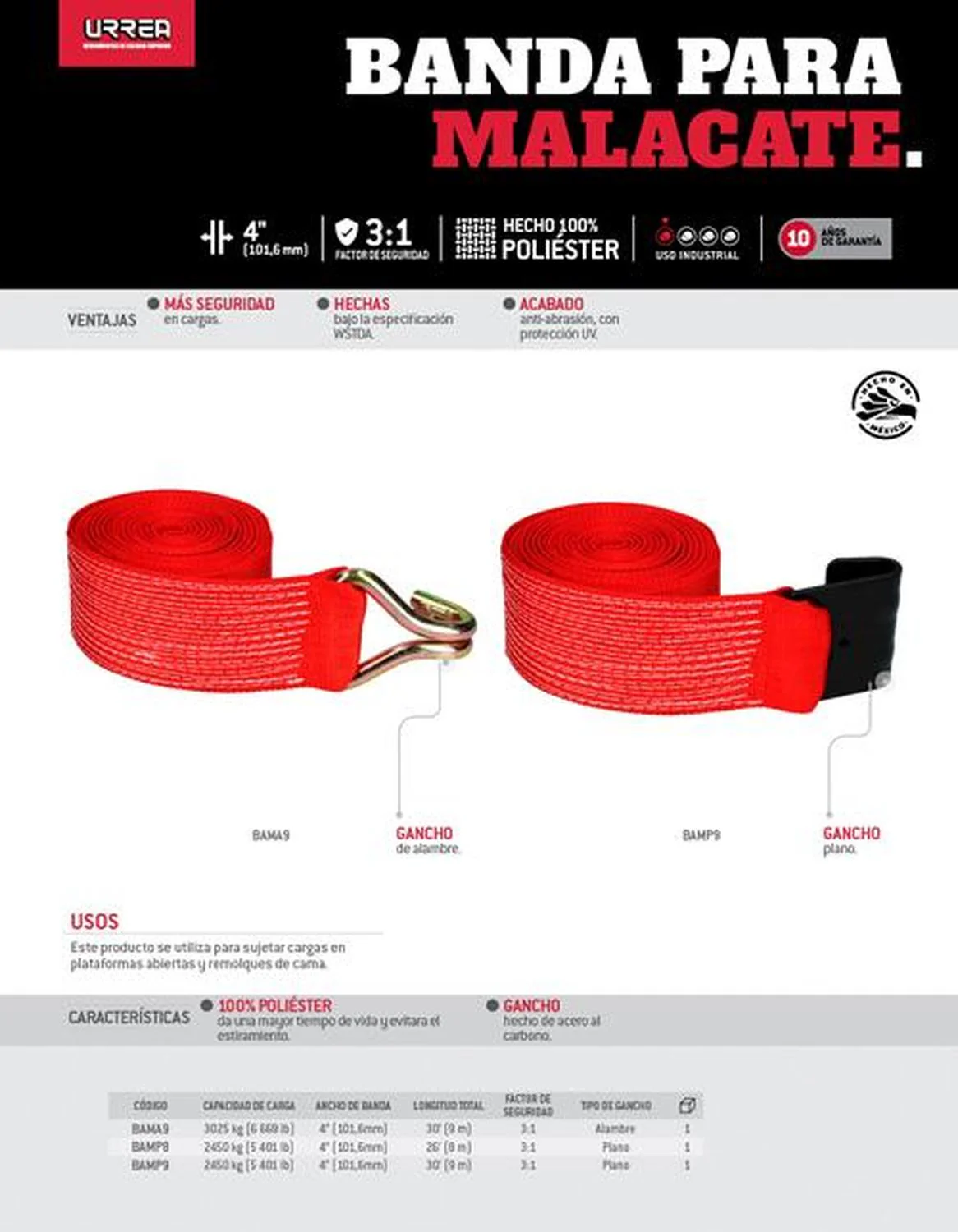Urrea Banda para malacate 4″x9m con gancho de alambre uso industrial BAMA9